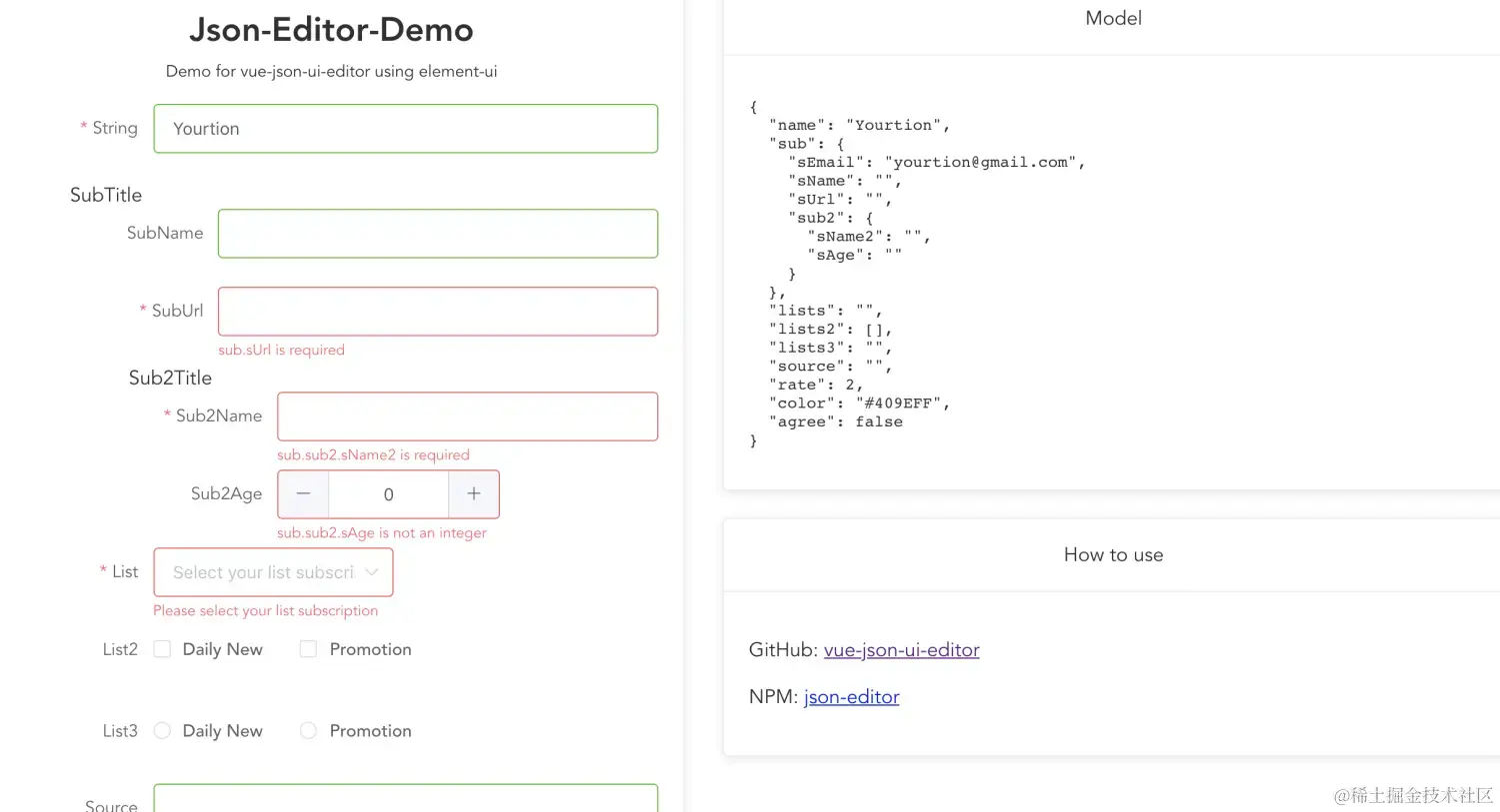 vue-ui-json-editor 官方的例子中一些输入组件验证不太完善,如 number 类型组件的上下限验证等,需根据项目实际情况自行调整。