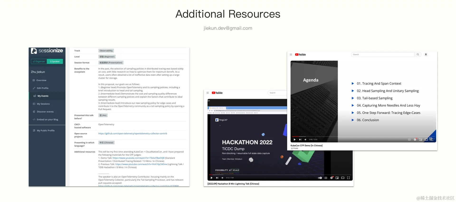 作为首次参与的分享者,我提交了 2 段分享视频,分别是 2022 年参加 TiDB Hackathon 的 Lightning Talk 以及临时录制的与投递内容相关的分享。因为是单盲审稿,这些材料有助于让审稿人了解投递者对内容的掌握程度以及讲述能力。