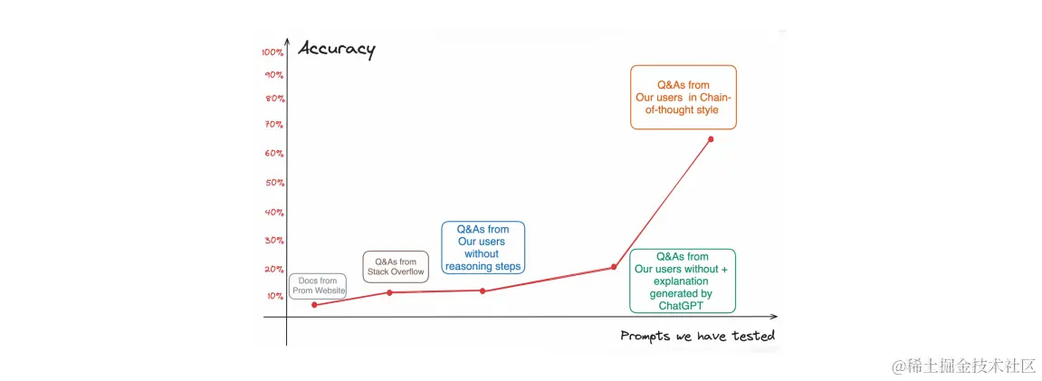 那么首先得教会机器人如何回答。如果直接把简单的 PromQL 的文档、Stack Overflow 回答、企业内 Q&A 文档当作提示词(Prompt)丢给它,训练出来的机器人只能获得极低的回答准确率。因此,这里引出了 Chain-of-Thought Prompt 的调优思路,也就是不直接告诉机器人结果,而是给它一步一步解释结果是怎么来的。举个例子: