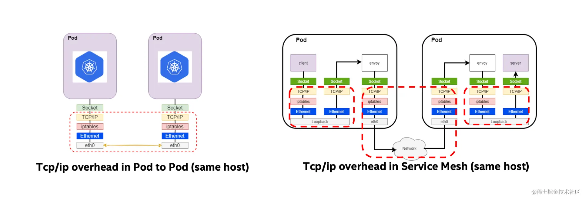 在 Kubernetes 部署的大背景下,由于每个 Pod 都有自己的网络协议栈,因此数据包从一个 Pod 发送到另一个 Pod 时会多次经过完整的网络协议栈。这会带来一些耗时上的影响,而当 Service Mesh 存在时,数据包又要额外地经过 Sidecar,所以这种开销将会成倍地上涨。