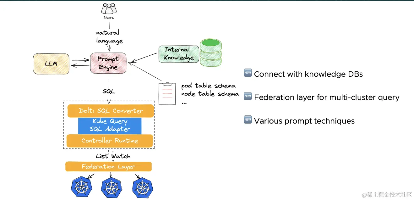 受 DB-GPT 影响可以联想到,有一种更成熟和容易审计的语言:SQL。如果在 LLM 和 Cluster 之间实现一层 Cache,这层 Cache 可以使用 SQL 作为查询语言,LLM 就可以输出结构化的 SQL 直接使用,Cache 起到保护 Cluster 操作的作用。