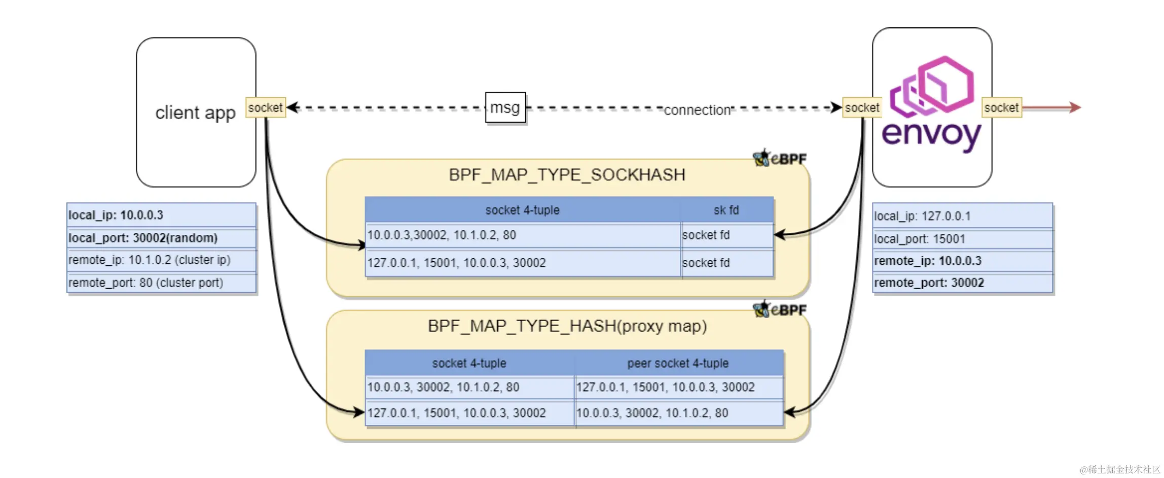 借助 eBPF,可以通过 BPF_PROG_TYPE_SOCK_OPS 将所有建立连接的 Socket 捕获并置入 map 中;当有 TCP 事件产生时,可以通过 BPF_PROG_TYPE_SK_MSG 感知并实现 Socket 数据的重定向。