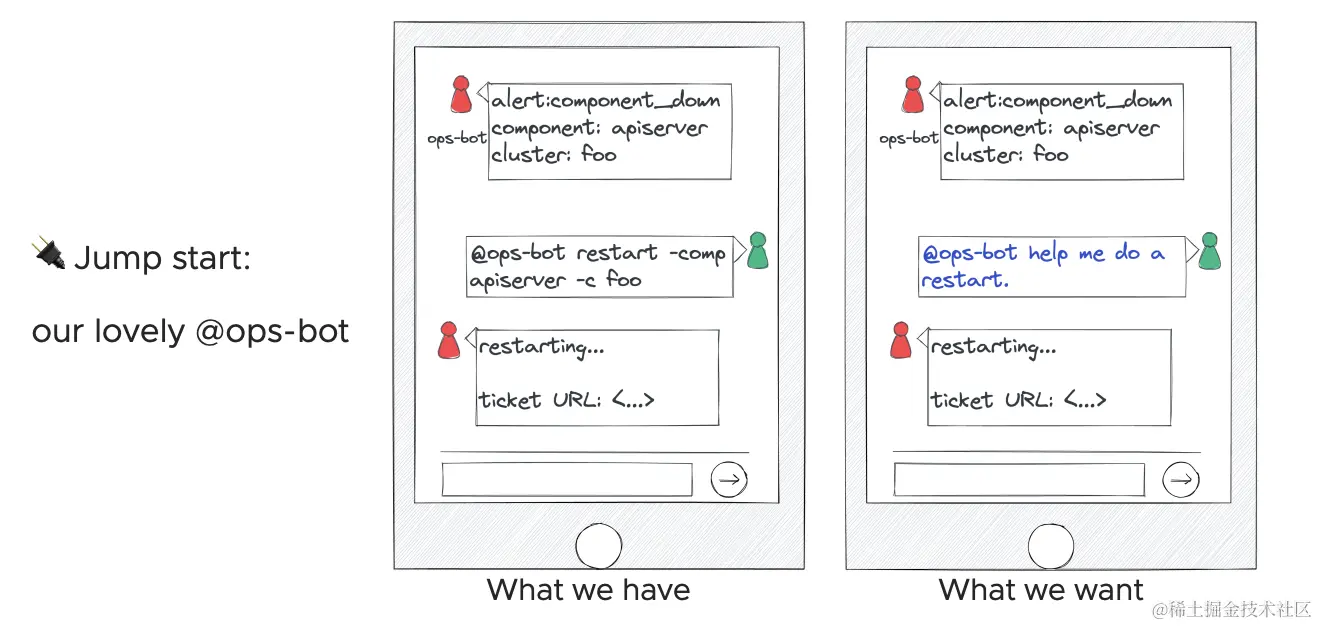 我们直接从分享的中间部分开始回顾,或许很多企业都有设计过 IM 机器人帮助执行 kubectl 或者其他命令,因为从接收到告警消息,打开你的 Terminal 或者浏览器,经过无数步骤,到最终登入服务器执行命令行——太麻烦了,远不如在 IM 工具上发消息方便。