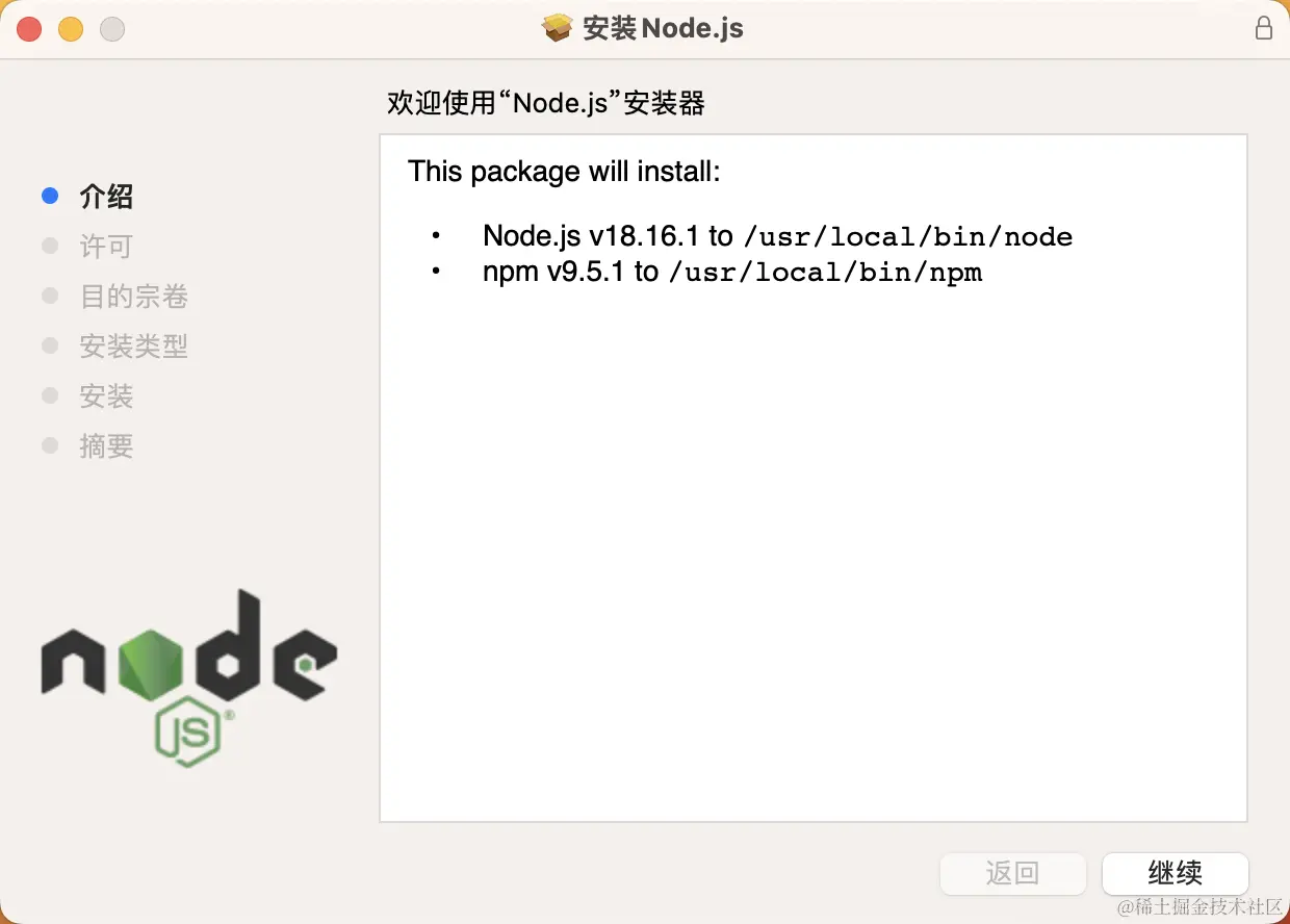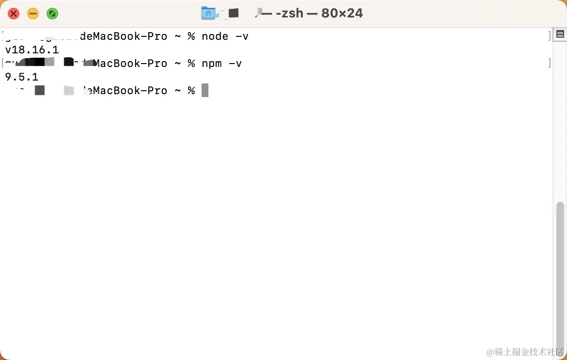 这个安装包含 Node.js 和 Npm。我这里安装的是 Node.js v18.16.1 和 Npm v9.5.1。可以在终端中通过 node -v 和 npm -v命令来分别查看 Node.js 和 Npm 版本: