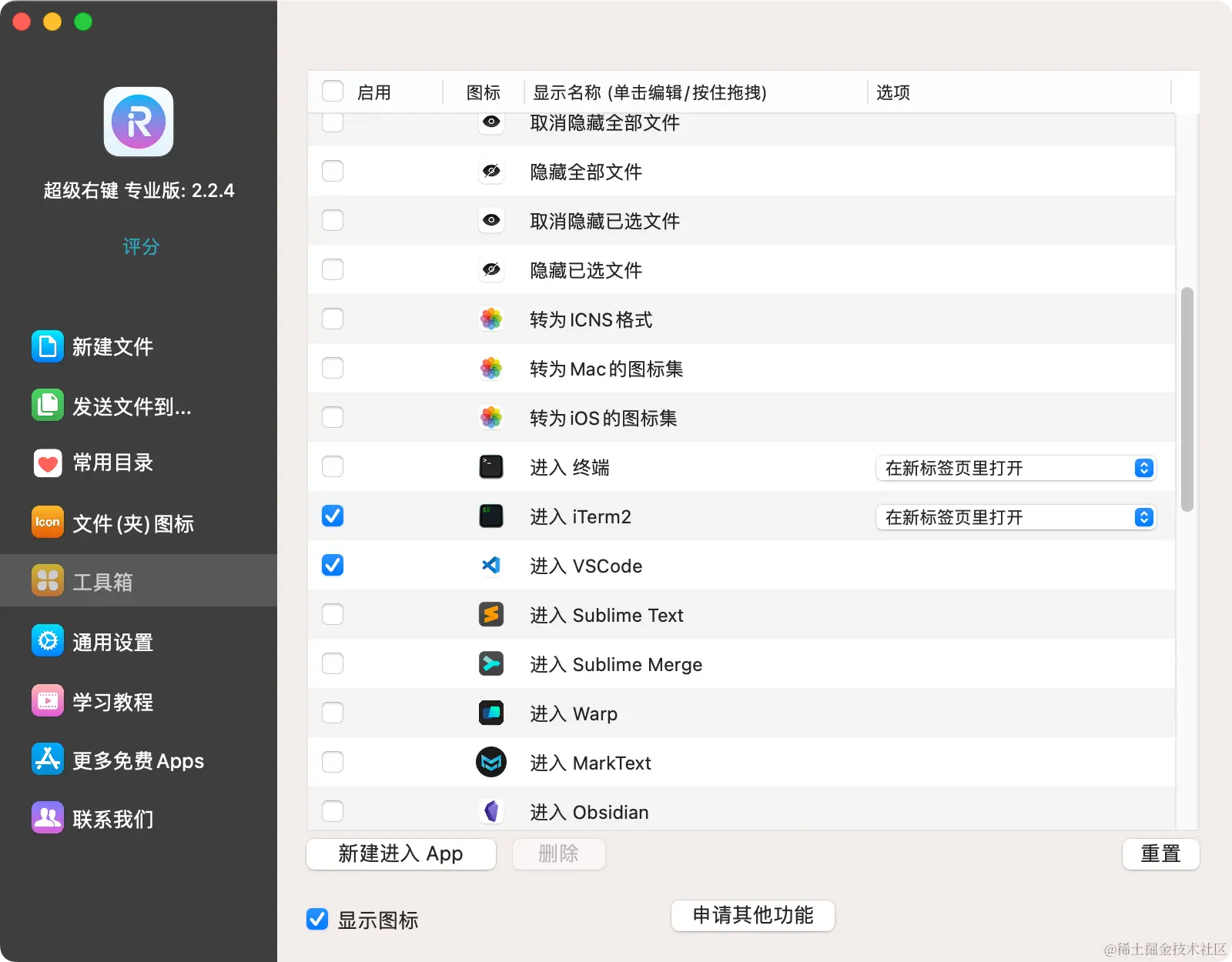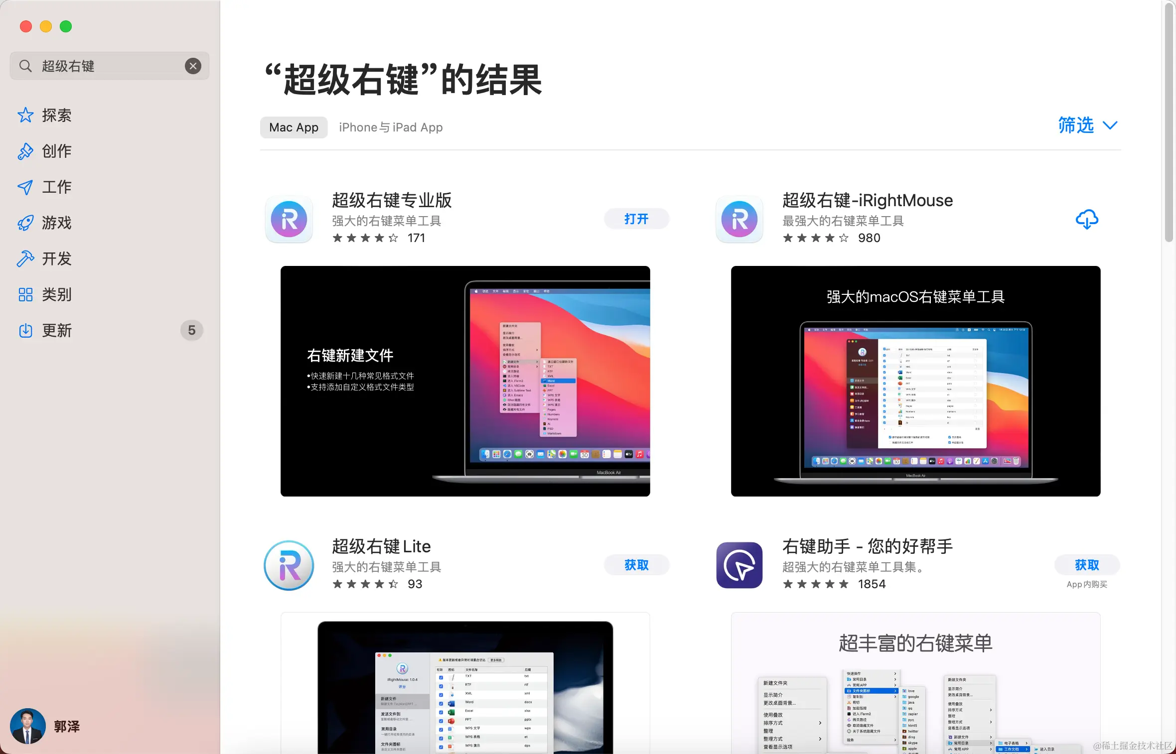 超级右键是一个用于 Mac 的右键增强工具,Mac 不像 Windows 那样可以右键直接创建文件之类的,这个软件就可以帮助我们在某些场景下提高工作效率。在 Appstore 中搜索超级右键,下载即可(专业版是收费的,其他是免费的,可以根据需要选择):