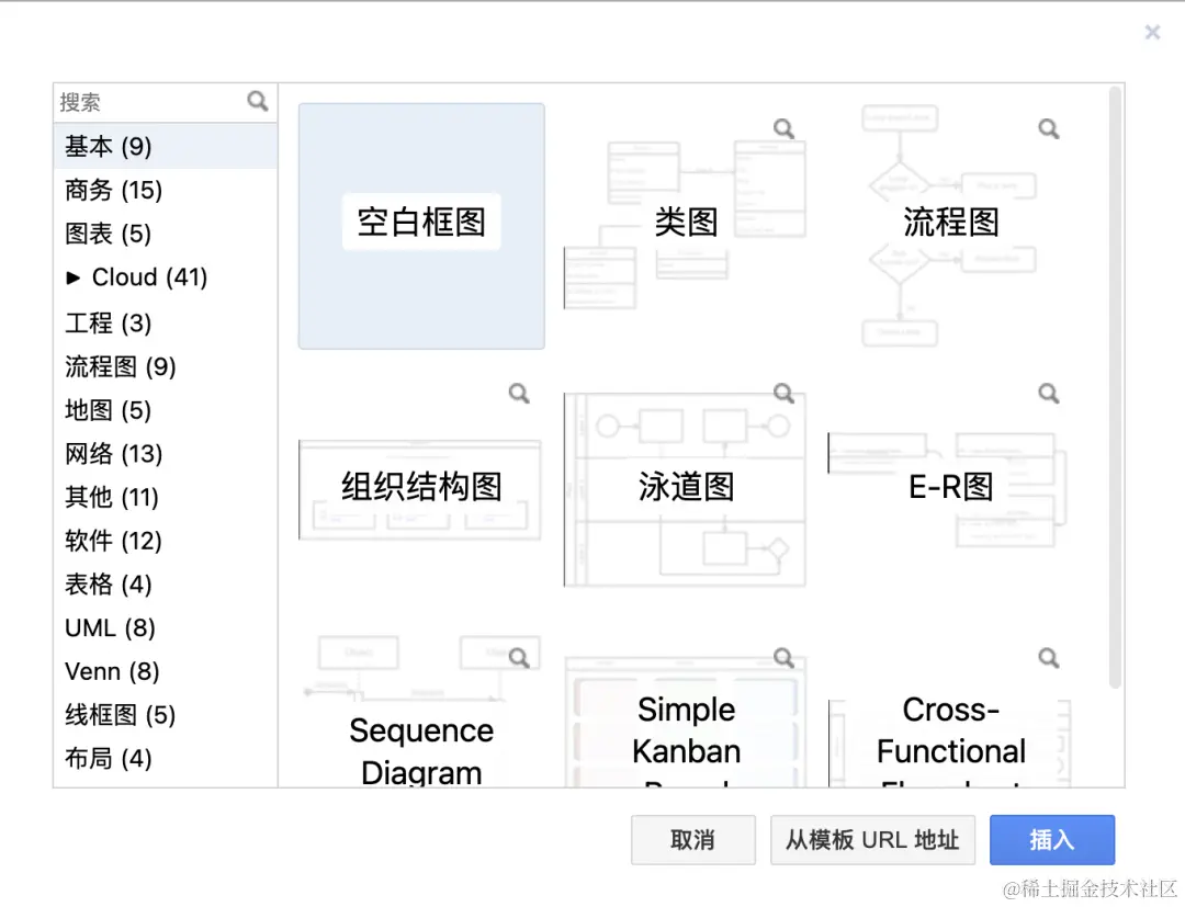draw.io 提供了丰富的模版,支持商务、图表、cloud、工程、流程图、布局、地图、网络、软件、表格、UML、Venn等。还可以自定义模板。