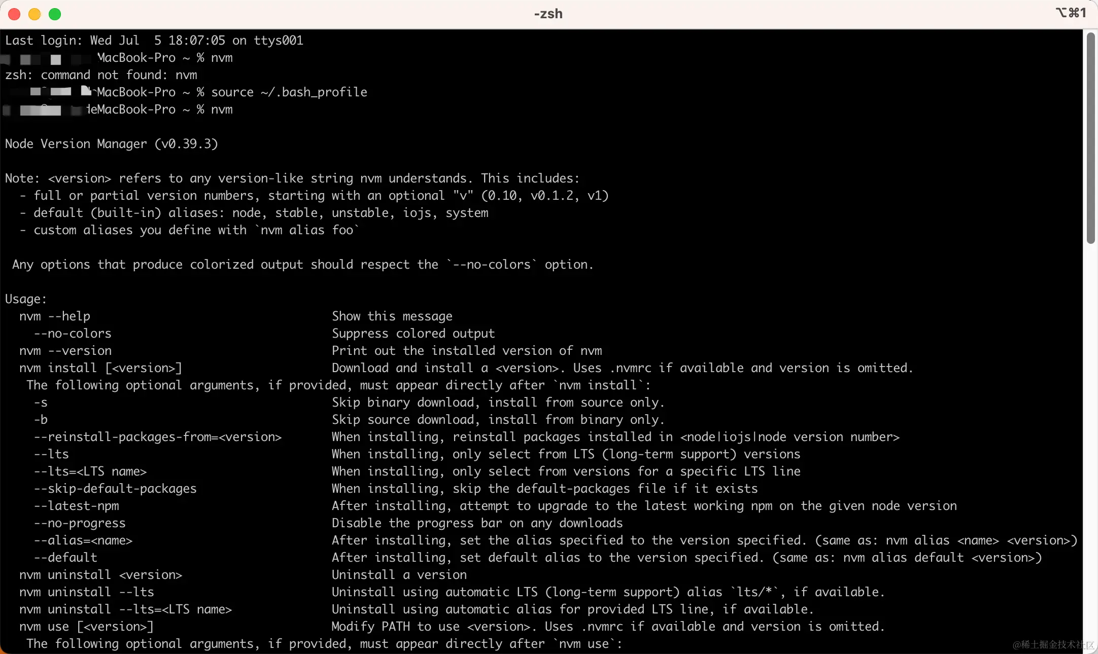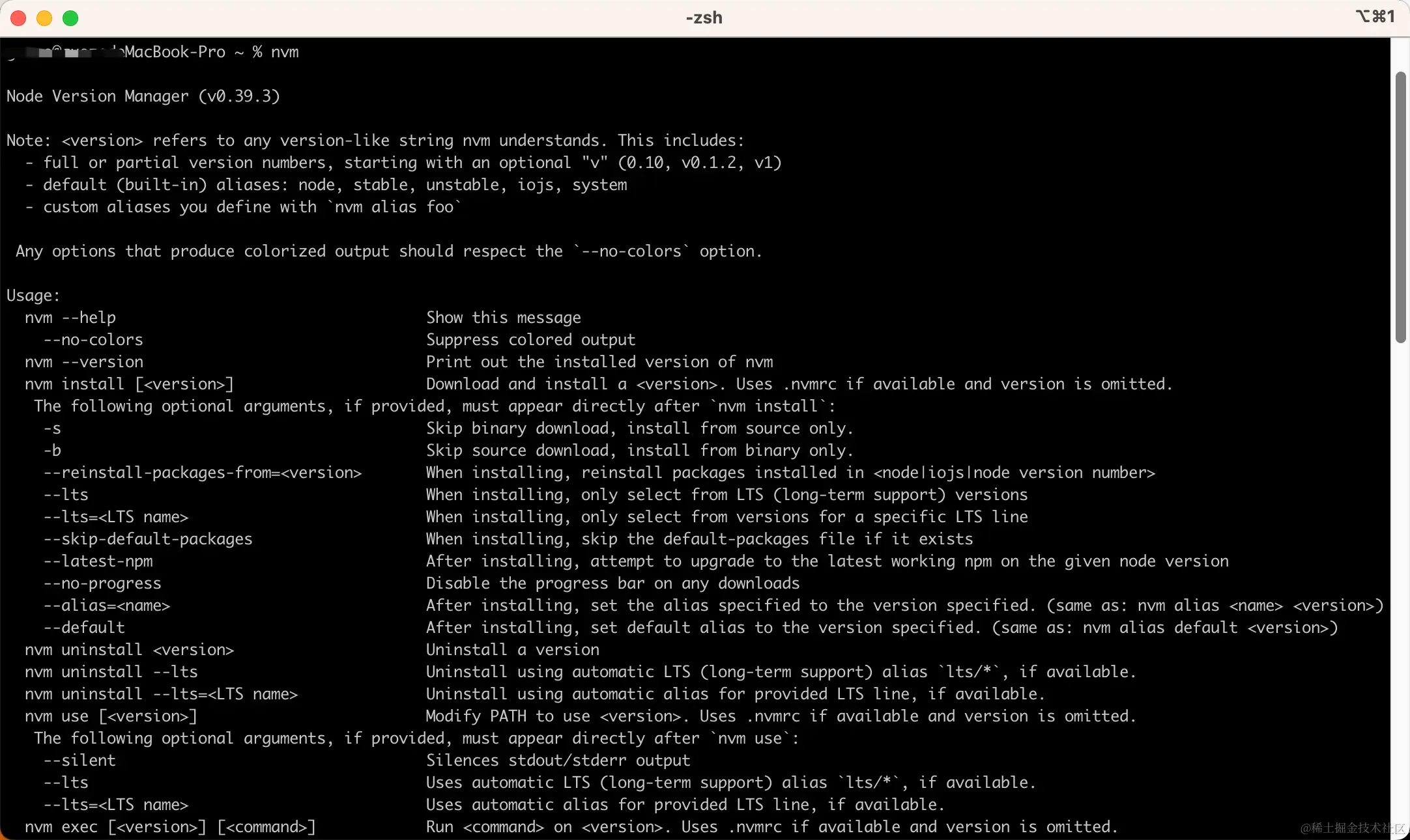 安装完成之后,重新打开终端,输入 nvm,如果出现以下内容就是安装成功了: