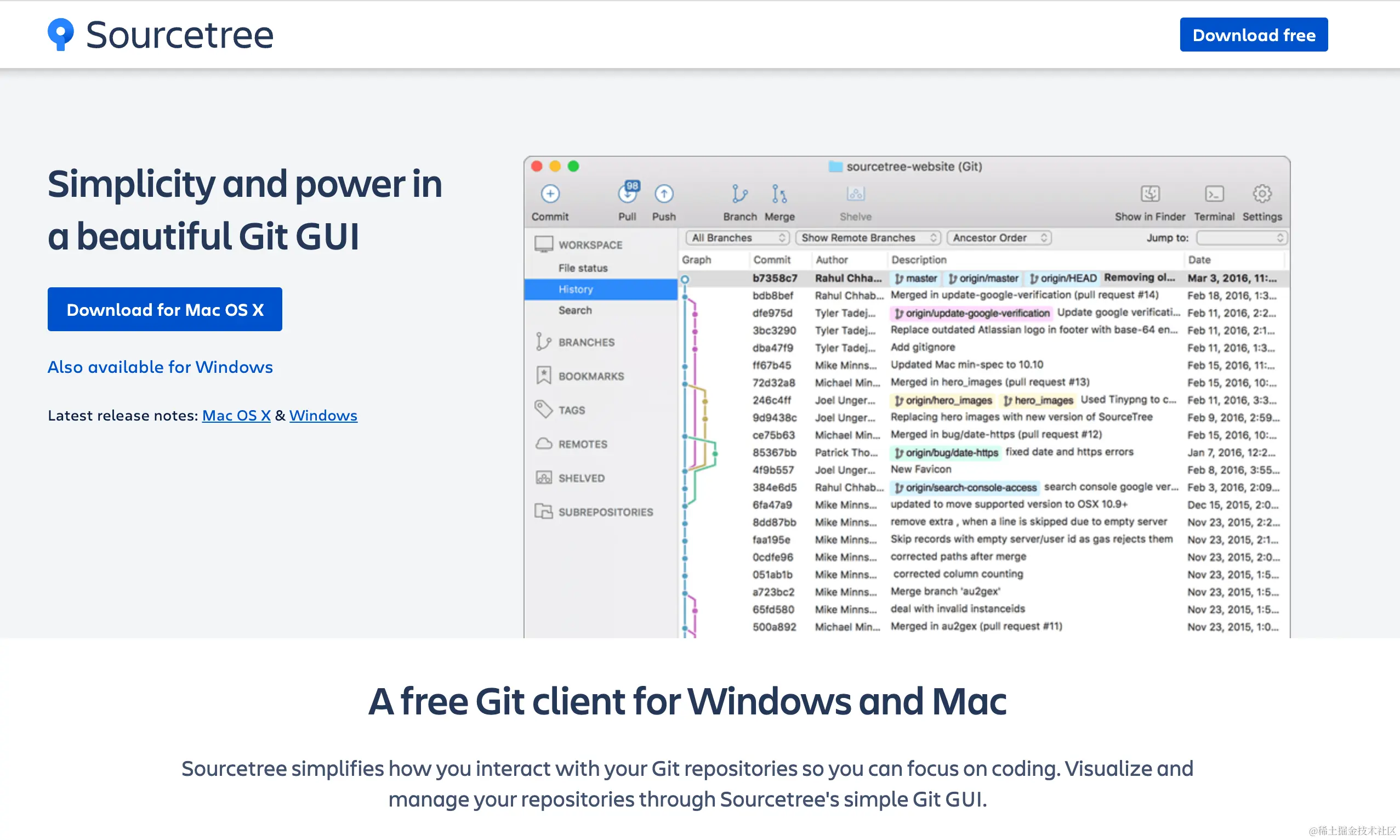 SourceTree 是一款免费的可视化 Git 和 Mercurial 版本控制工具,提供了直观的界面和强大的功能来帮助开发者更轻松地管理代码仓库,其特点如下: