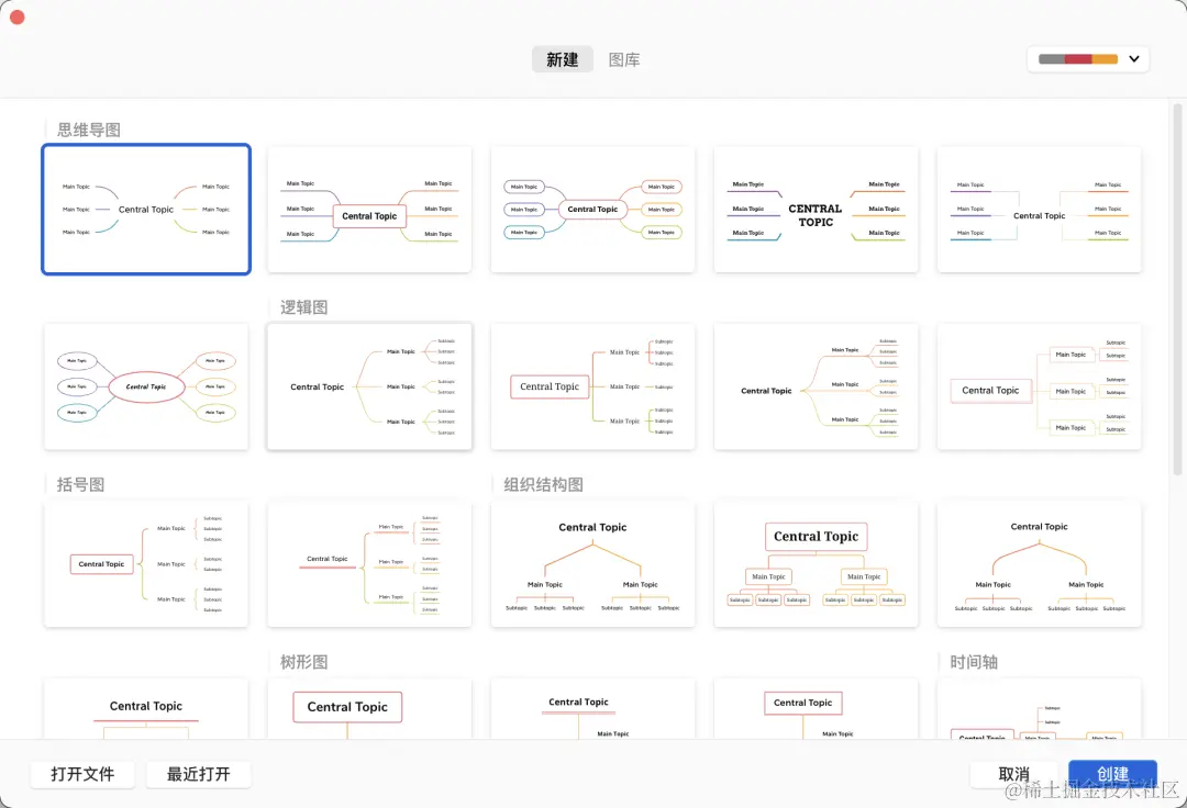 XMind 是一个跨平台的思维导图软件,具有多种结构样式,除了普通的思维导图,还包括树形图、逻辑图、鱼骨图、时间轴、树状表格等等,不同的结构样式可以自由组合混用,同时支持一键更换结构样式。其提供了很多类型的思维导图,并支持设置多种主题风格: