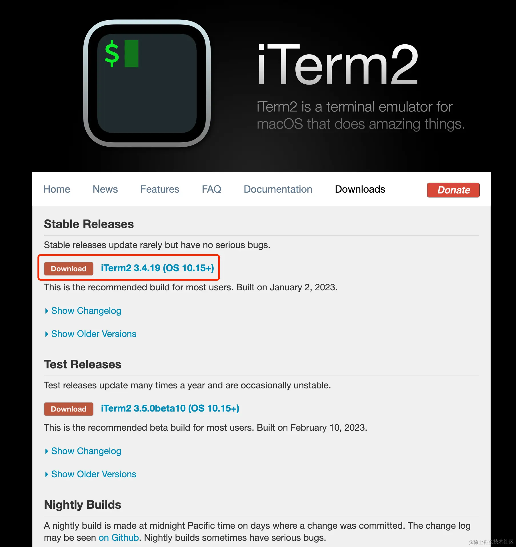 iTerm2 的安装也很简单,只需要在官网(**iterm2.com/downloads.h…