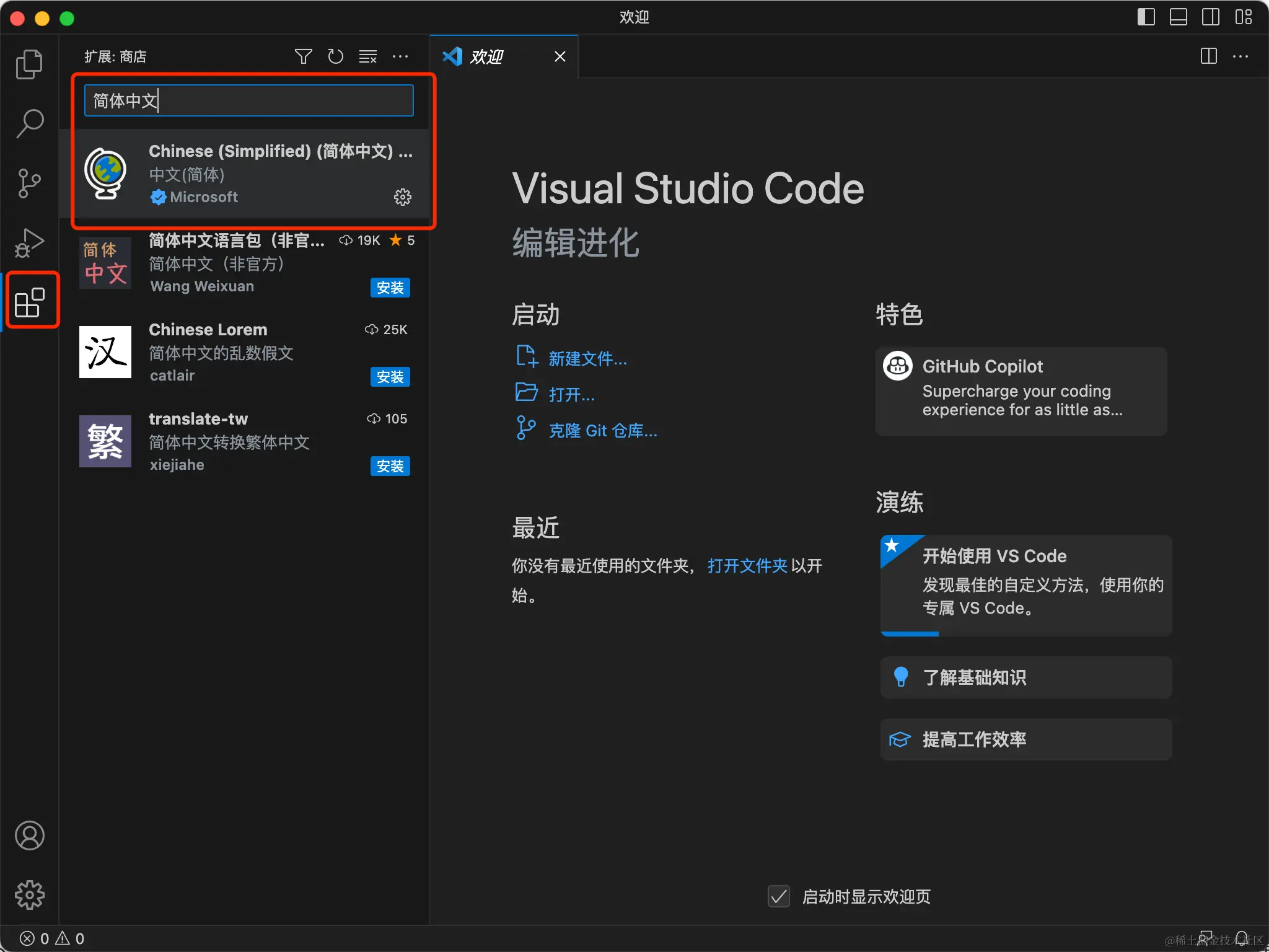 默认是英文版,如果需要中文版,可以在插件市场中下载官方提供的简体中文插件:
