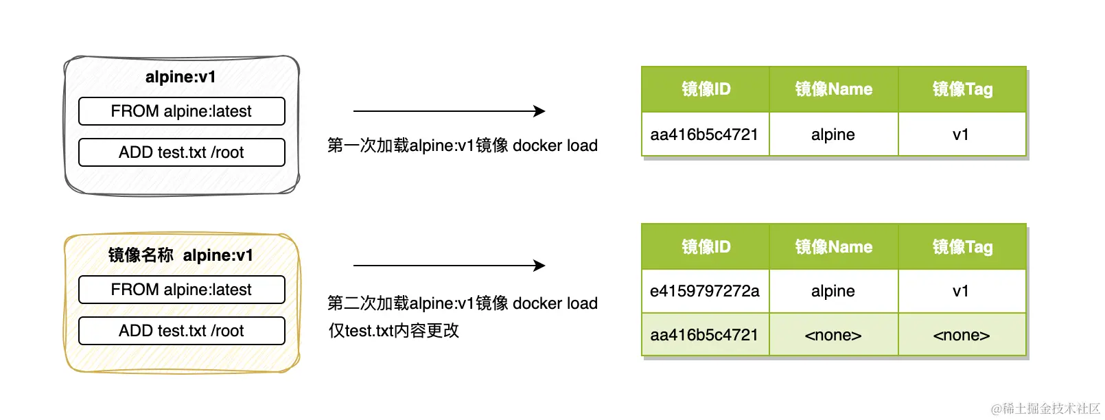 操作中,将alpine1:v1.0镜像没有按照镜像:tag方式 save,而是使用 docker save e4159797272a 镜像ID格式保存, 仅仅微小的变化会导致镜像加载时的效果不同。
