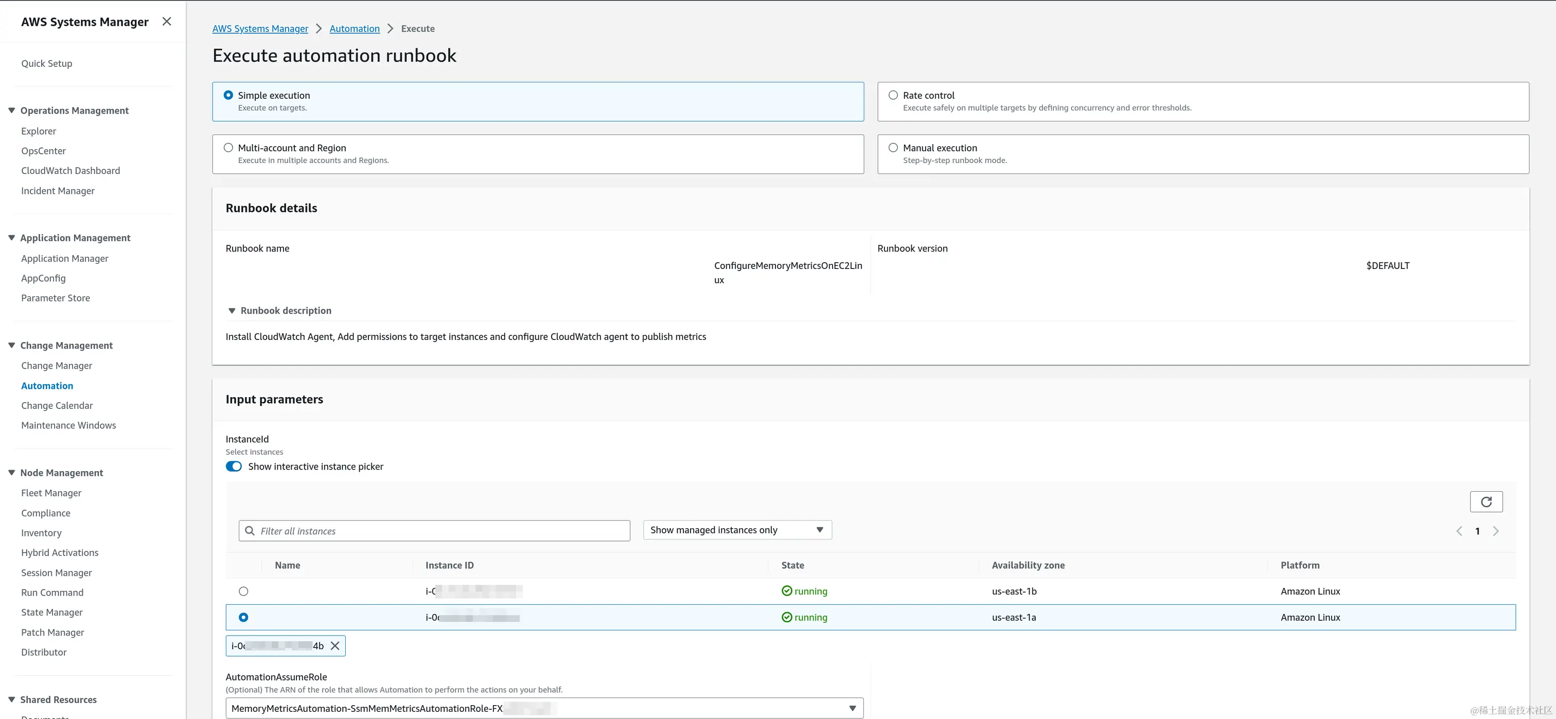 然后选择simple execution并选中我们需要安装监控的EC2,最后选择前面创建的SsmMemMetricsAutomationRoleName(一般名称为MemoryMetricsAutomation-SsmMemMetricsAutomationRole-xxxx),然后提交