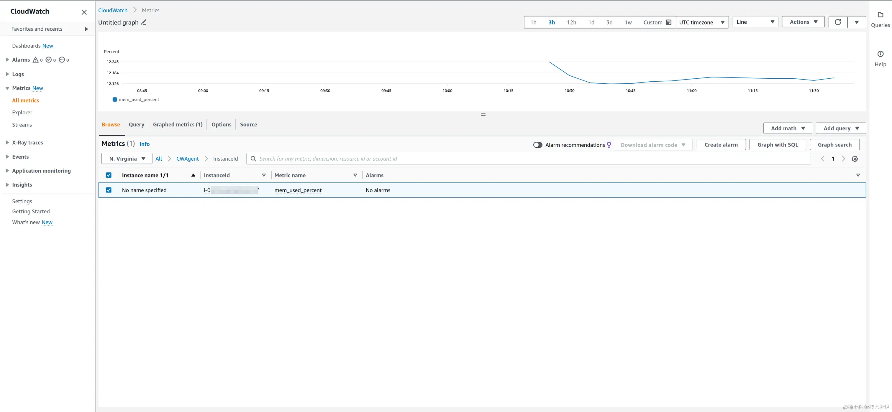 等几分钟后内存指标会被上报到cloudwatch中,最后我们可以在cloudwatch里面看到内存的使用情况