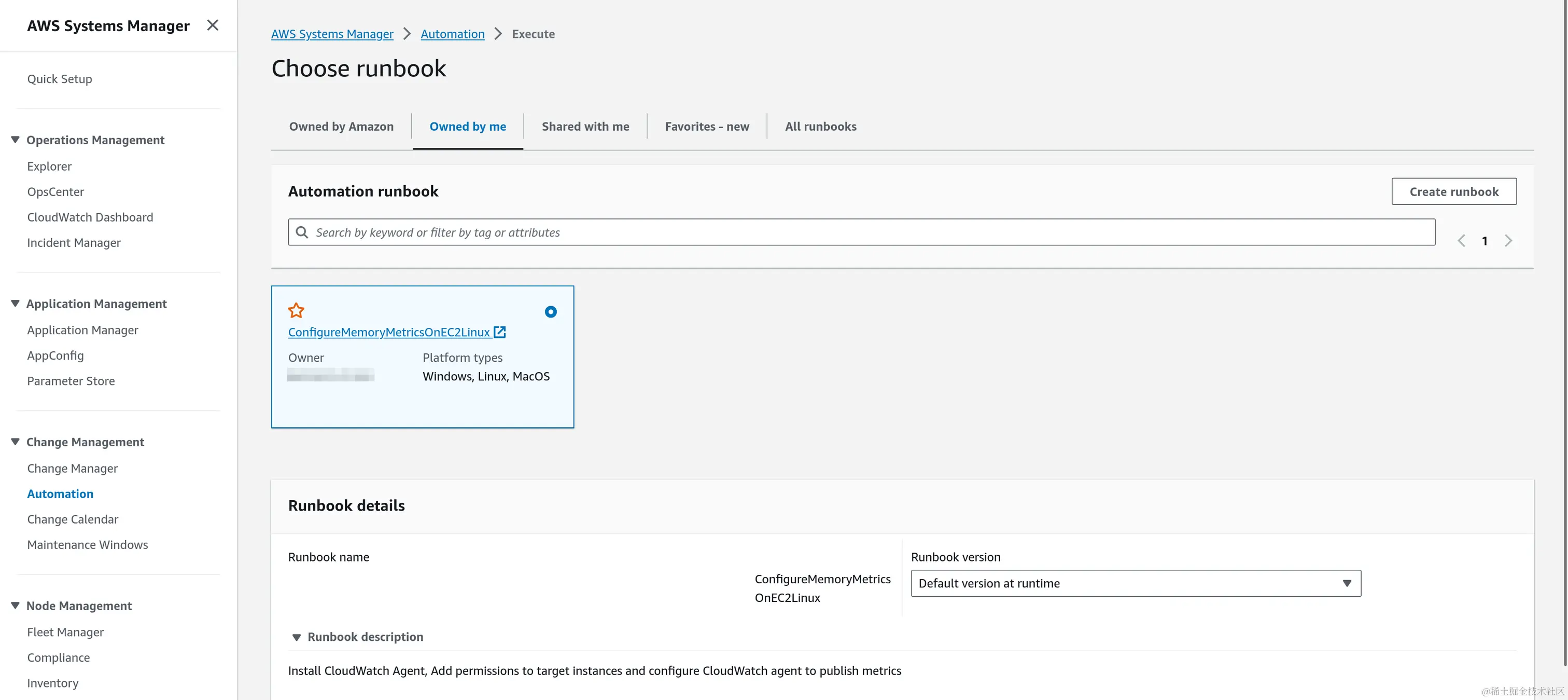 接着点击Execute automation,选择我们前面创建好的runbook,这里我选择Owned by me->ConfigureMemoryMetricsOnEC2Linux