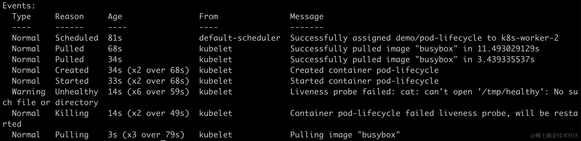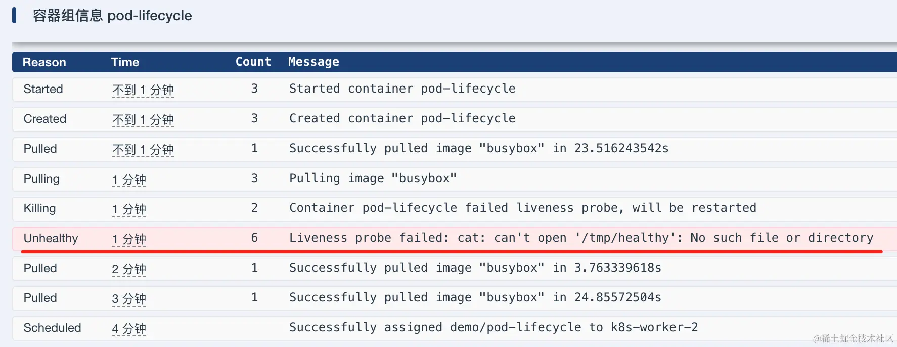 出现问题时也不用慌,可以通过kubectl get pods -n demo -o wide 和kubectl describe pod pod-lifecycle -n demo排查。可以清晰的看到异常的原因:存活检查失败。