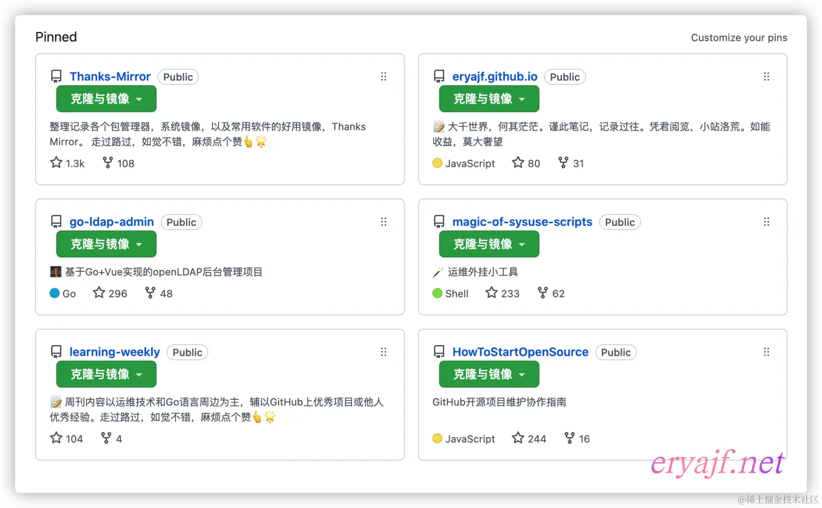 通过如下配置,我们可以将更多自己想要钉住的项目钉在个人主页:
