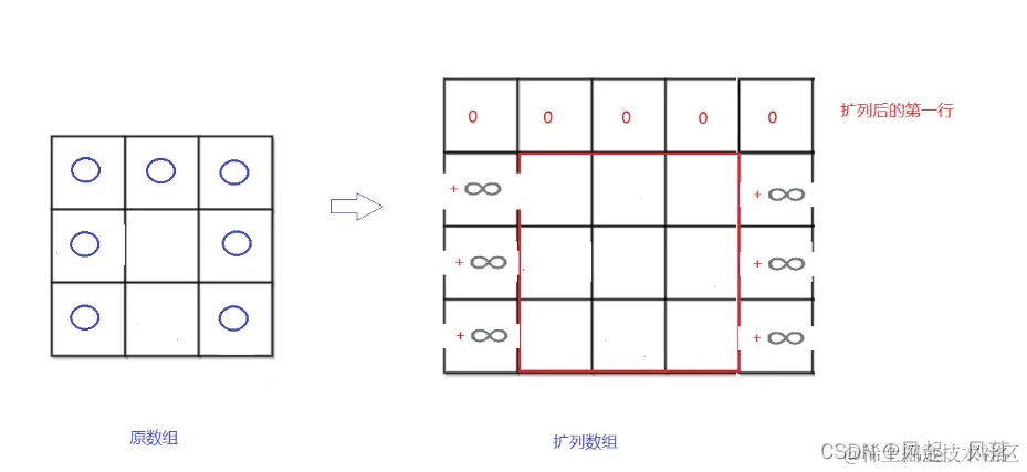 原数组的第一行,只能从当前位置到当前位置,所以储存原始数组元素的值 为了保护影响原数组的第一行的值,所以扩列后的数组第一行 都为0