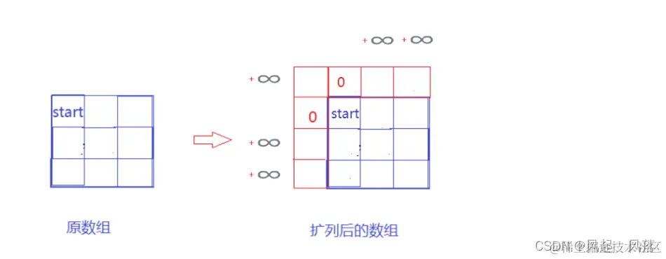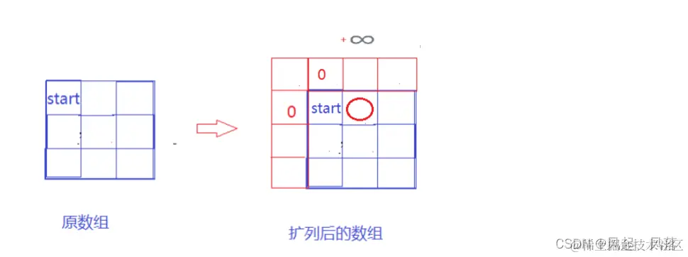 因为此时并没有上一个位置或者左一个位置,所以dp 数组起点位置(start)的值应为 原数组内对应起点位置的值 为了不影响结果,将start对应的上一个位置和左一个位置都设置为0