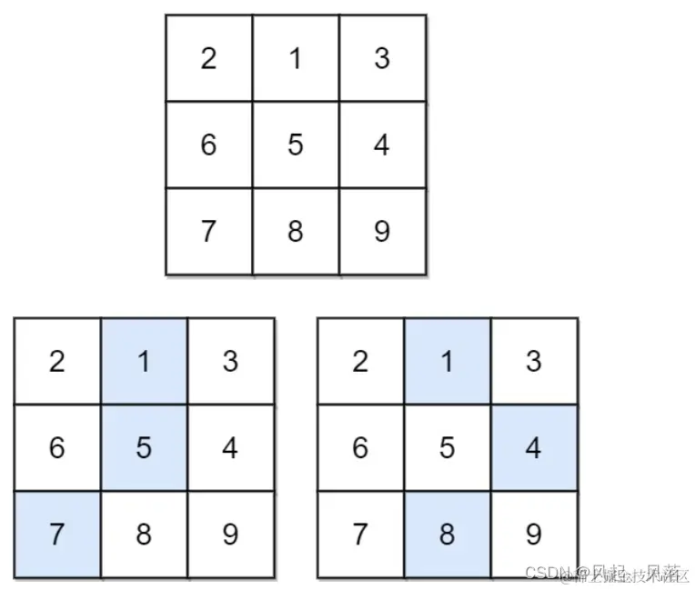 输入:matrix = [[2,1,3],[6,5,4],[7,8,9]] 输出:13 解释:如图所示,为和最小的两条下降路径