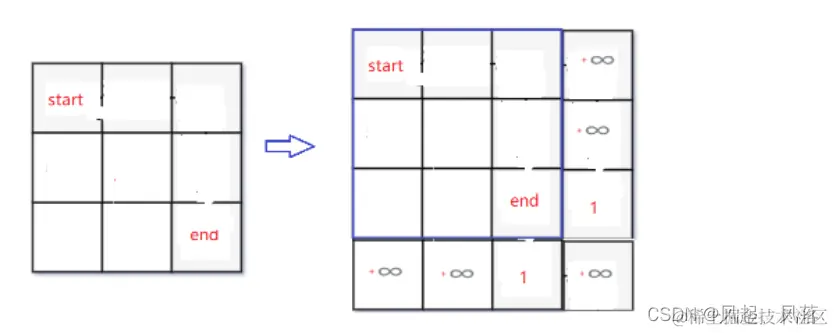 当前红色区域位置,是需要比较它位置的下一个位置和右一个位置 取其中的小的那个位置, 但是下面的位置是虚拟的,所以不能算上,否则会干扰结果 所以其位置设置为 正无穷大
