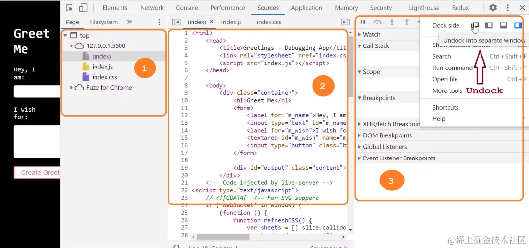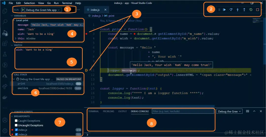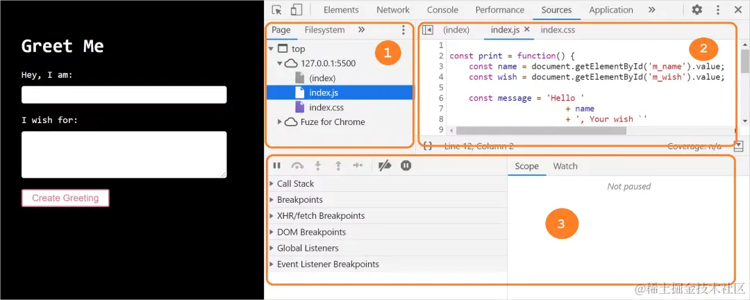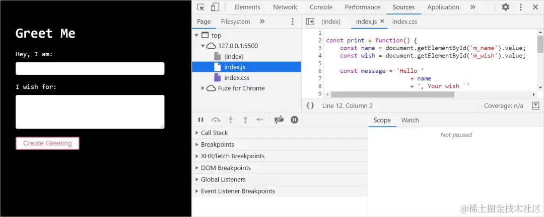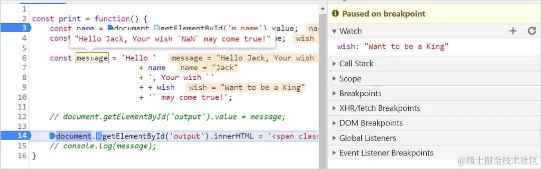 当输入两个表单值之后,“愿望”部分没有正确打印,而是打印出了NaN。代码在线调试:greet-me-debugging.vercel.app/。接下来,就看看 Chrome DevTools 有什么功能可以调试定位代码的问题。