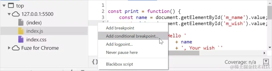 - 右键单击行号并选择"Add conditional breakpoint"来添加条件断点:
