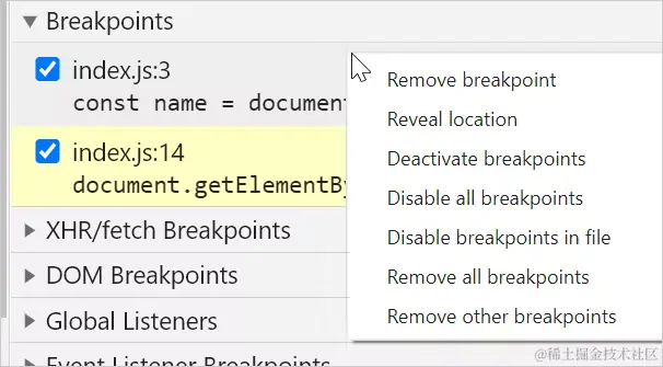 通过取消选中的复选框,可以从“Breakpoints”面板中删除一个或多个断点。通过右键单击并选择“删除所有断点”选项,可以删除所有断点: