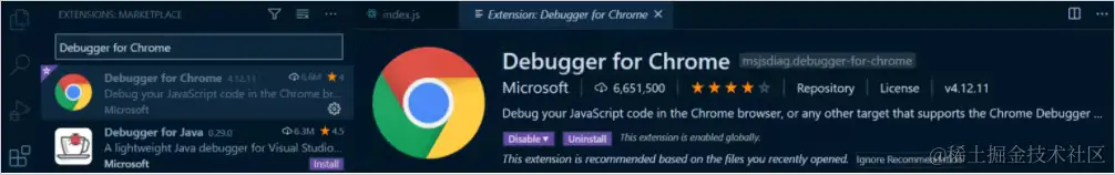 Visual Studio code 中一些实用的插件可以用于 JavaScript 代码的调试。可以安装一个名为“Debugger for Chrome”的插件来调试代码: