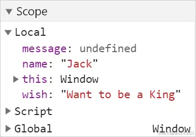 可以在 Scope 选项中查看局部范围和全局范围内的内容以及变量,还可以看到 this 的实时指向:
