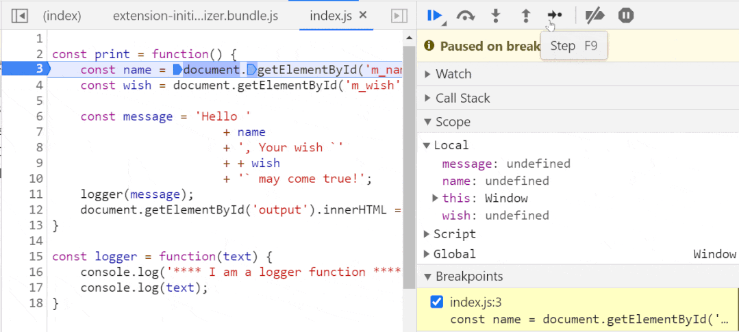 如果 DevTools 窗口较宽或未在单独的窗口中打开,则调试器部分将显示在代码编辑器的右侧: