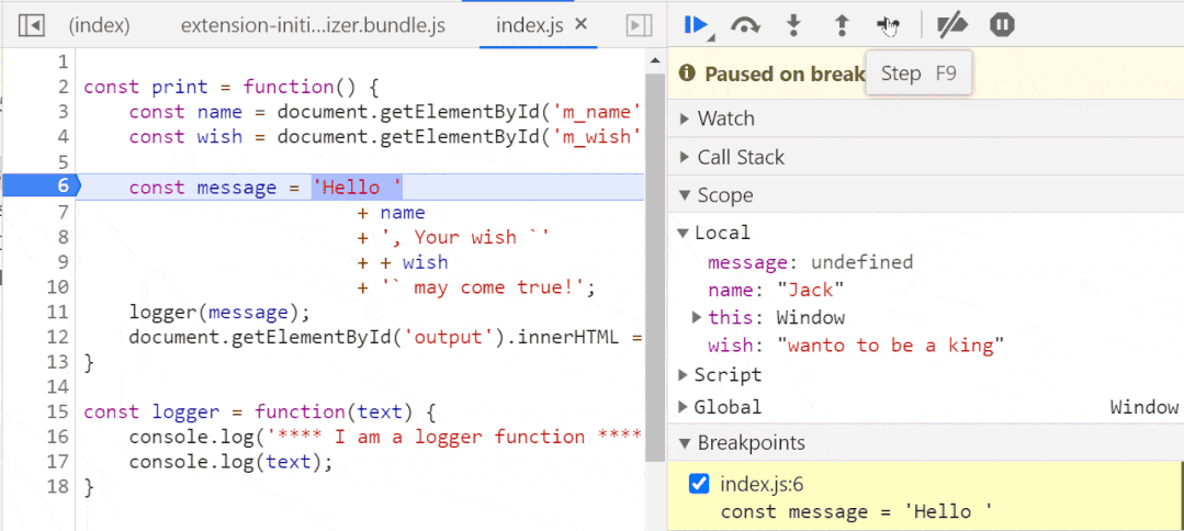 Watch 部分允许添加一个或多个表达式,并在执行时监视它们的值。当我们想在代码逻辑之外进行一些计算时,这个功能非常有用。我们可以组合来自代码区域的任何变量,以形成有效的JavaScript表达式。在逐步执行时,就能看到表达式的值。