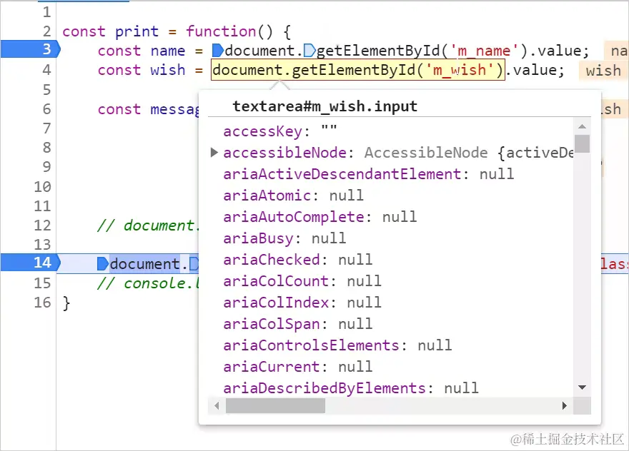 此外,我们可以选择打码的一部分作为表达式来检查值。在下面的例子中,选择了表达式document.getElementById('m_wish') 来检查值: