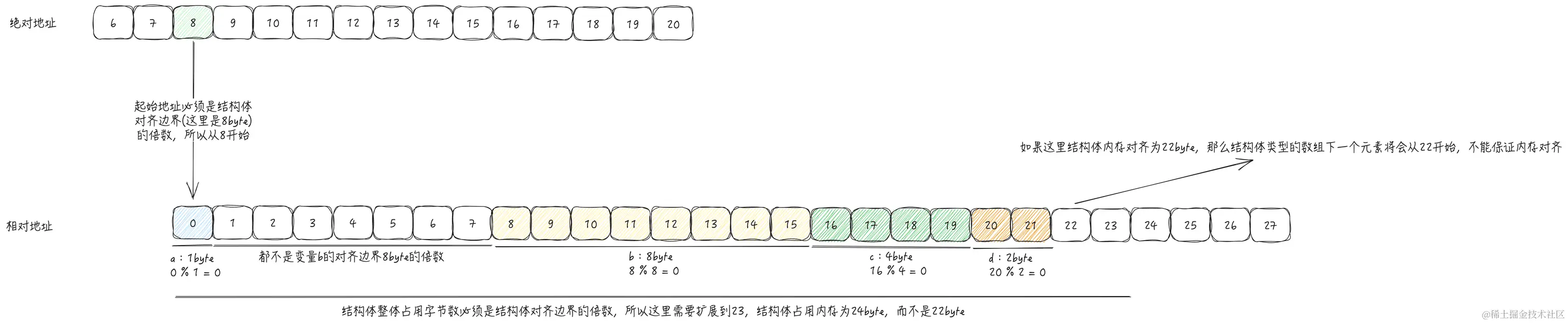 - 结构体整体占用字节数必须是结构体对齐边界的倍数。为了保证结构体数组的内存对齐