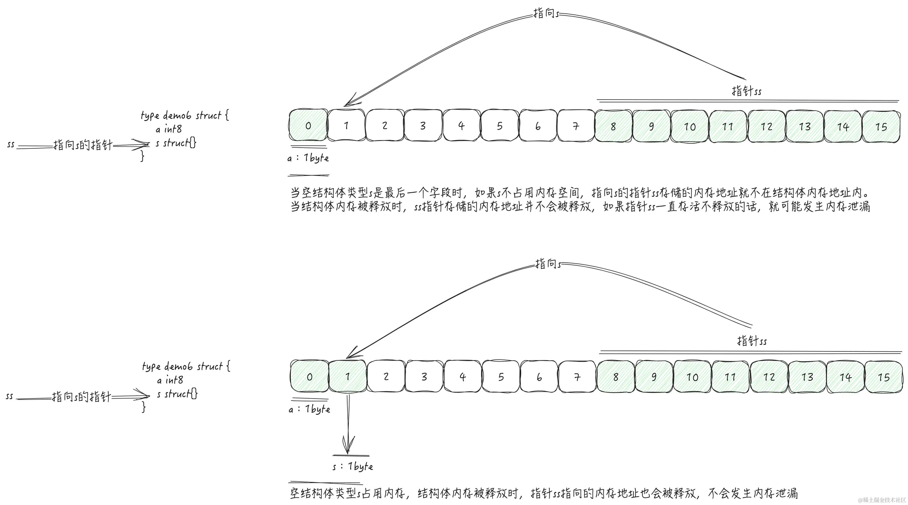 空结构体类型字段是最后一个字段时,需要占用内存,主要还是为了解决内存泄漏问题