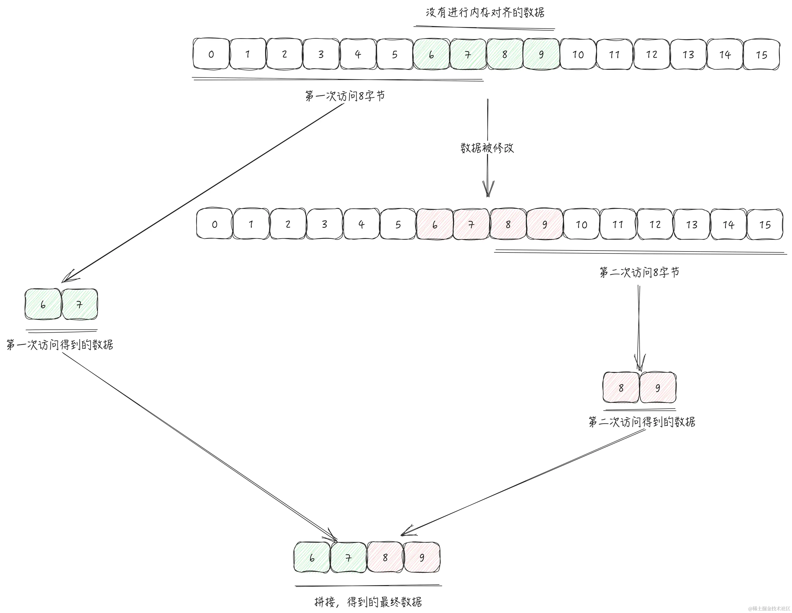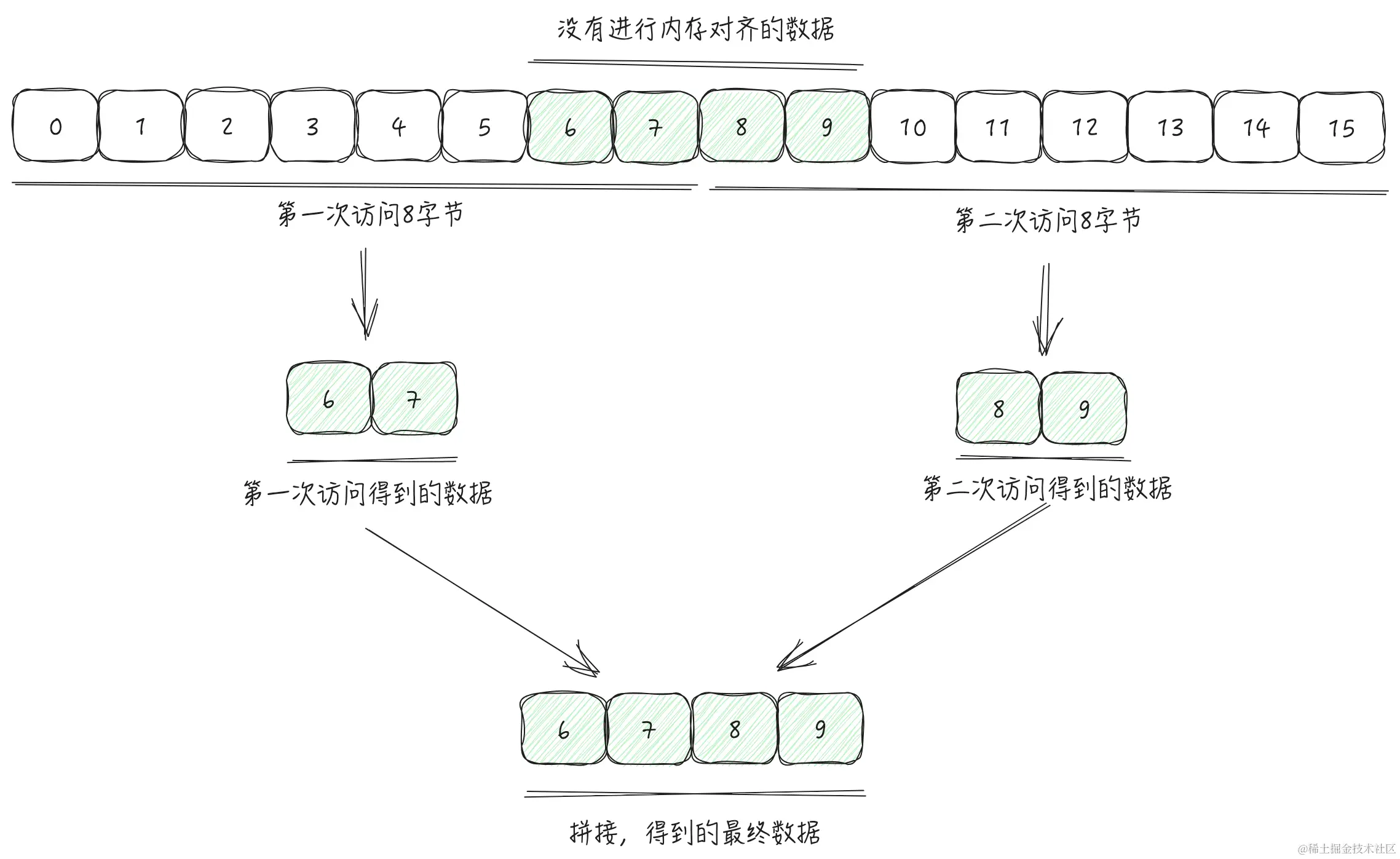 - 性能原因:CPU为了加速对内存的访问速度,并不是一个字节一个字节的去访问内存,而是一次访问多个字节,一般称之为字长。32位CUP的字长一般是4字节,64位CPU的字长一般是8字节。如果没有进行内存对齐,那么CPU在访问一个变量时,可能需要进行多次读取,然后进行拼接,才能得到最终的变量内容。进行内存对齐后,可以减少CPU访问内存次数,提升性能