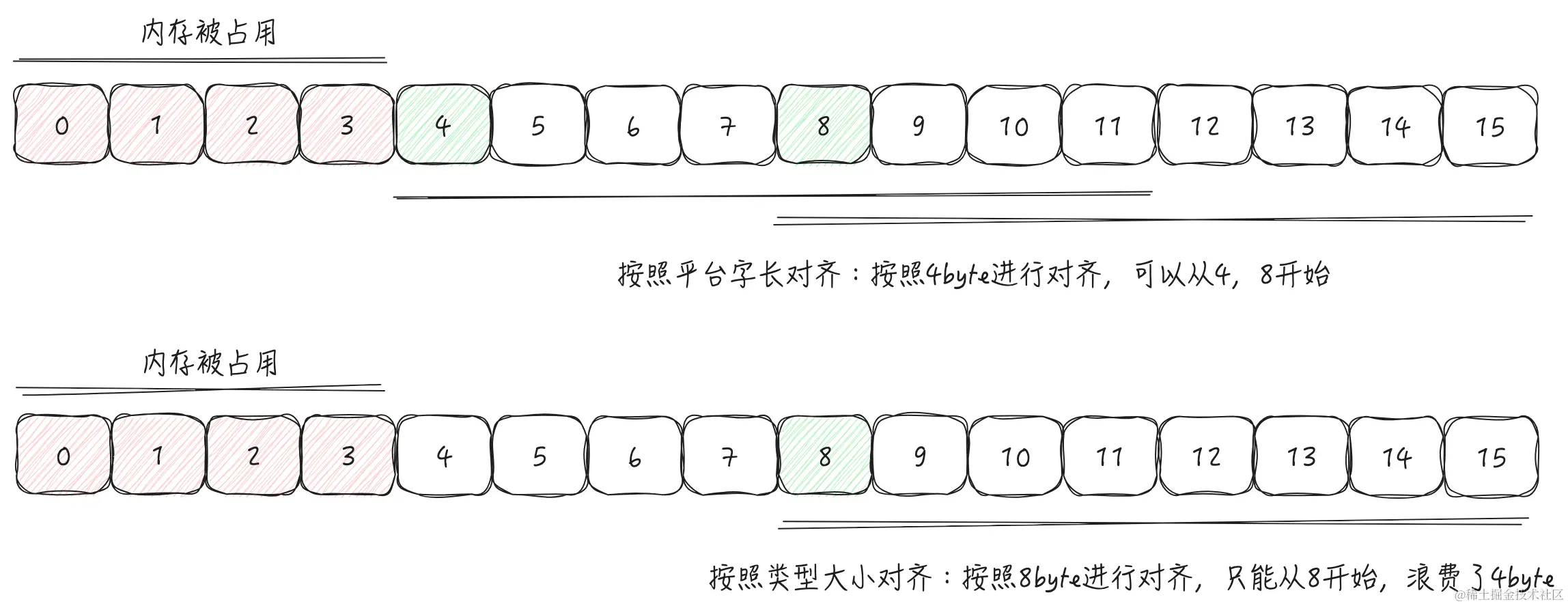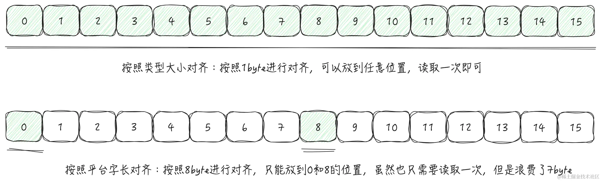 - 当类型大小 < 平台字长时,int8类型在64位平台进行内存对齐两种情况如图: