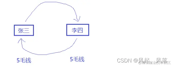 张三向李四要5毛钱 ,同时不释放自己的5毛钱 李四向张三 要5毛钱,同时不释放自己的5毛钱 两者形成环路, 当张三不给李四时,张三进行等待 当李四不给张三时,李四进行等待