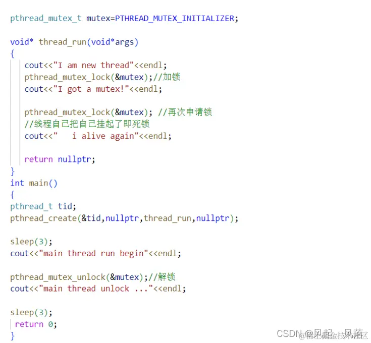 设置一个全局锁mutex,再自定义函数中由于两次申请锁,所以在第二次申请锁时,线程自己把自己挂起了 在主线程 设置解锁 ,看是否能帮助新线程中的锁进行 解锁 操作