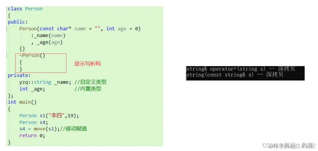 对于内置类型成员 _age,拷贝构造与 移动构造 都是完成浅拷贝