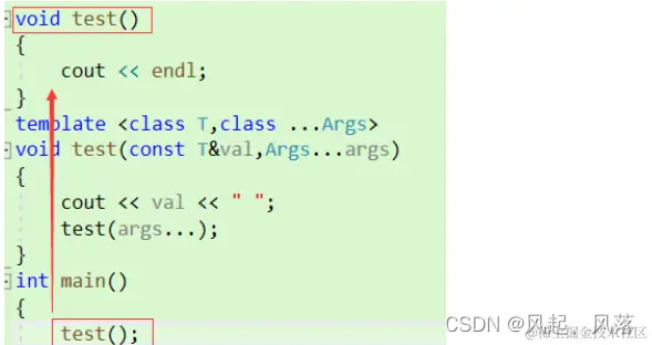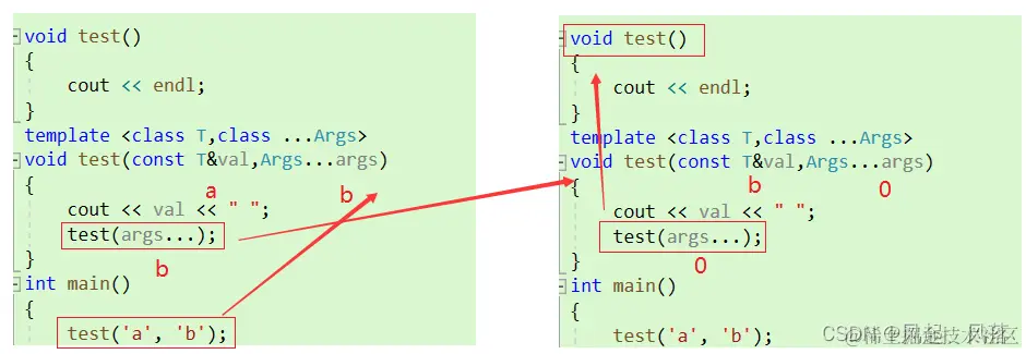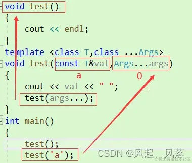 当有两个参数a和b时,将a传给test作为第一个参数val,将b传给test作为第二个参数 参数包 当test函数内部再次调用 test时,由于 参数包中的参数不为0,所以再次调用 带参的test