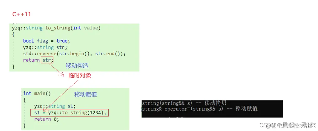 正常来说,str作为局部变量,应该作为左值,但编译器会对其优化,通过使用move函数,其函数返回值为右值,所以会先发生移动构造 临时对象 本身就是看不见 摸不到的,所以取不到地址,它也是右值 所以又会发生 移动赋值