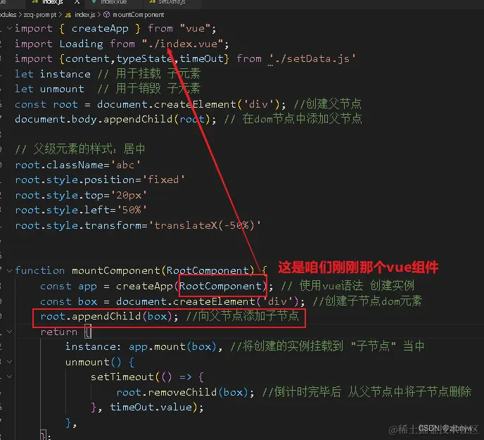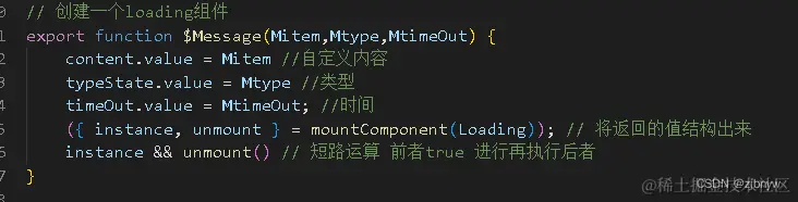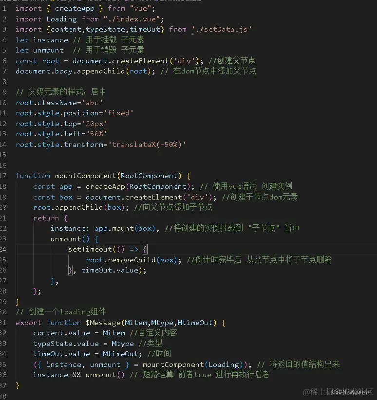 你看return里面还有一个unmount方法,他就是一个倒计时的工具人,在规定的多少秒厚再将它刚刚创建的那个子元素移除,来达到展示的效果