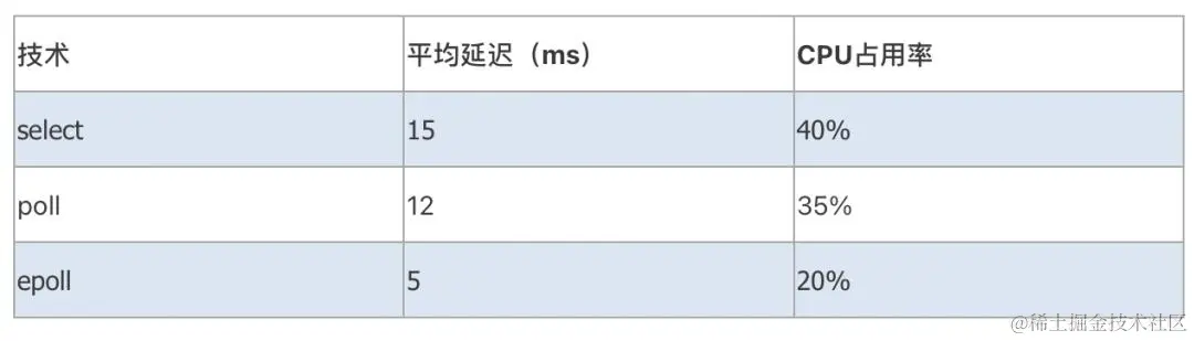 为了更直观地展示三种技术的性能差异,我进行了一个简单的实验。实验中,我创建了 1000 个并发连接,并且在每个连接中执行一次读操作。实验结果表明,当使用 select 或者 poll 时,读操作的延迟较大,且 CPU 占用率较高。而使用 epoll 时,读操作的延迟较小,且 CPU 占用率较低。具体实验数据如下表所示: