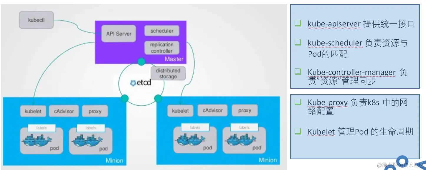 - Master Node:作为控制节点,对集群进行调度管理;Master Node由API Server、Scheduler、Cluster State Store和Controller-Manger Server所组成;