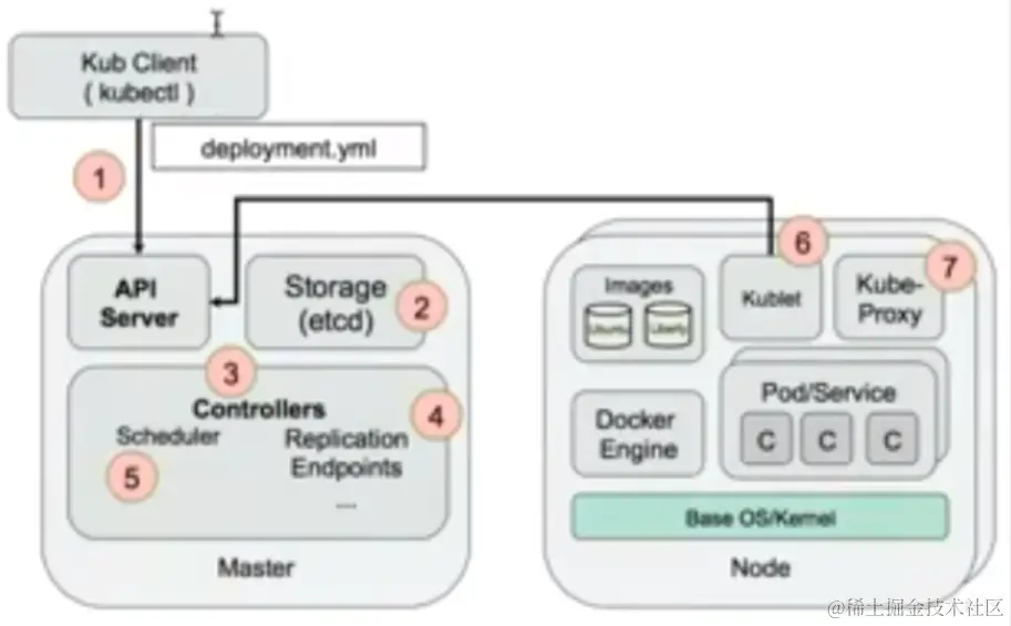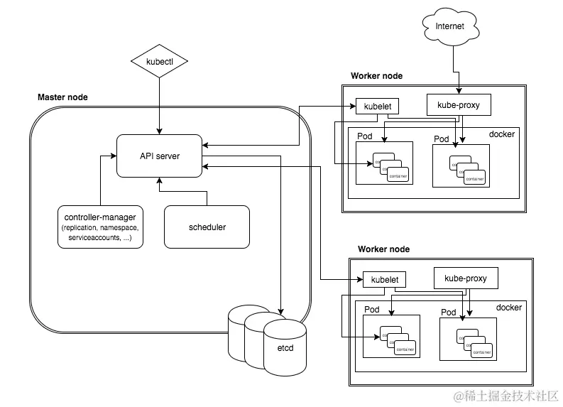 Kubernetes属于主从分布式架构,主要由Master Node和Worker Node组成,以及包括客户端命令行工具kubectl和其它附加项。