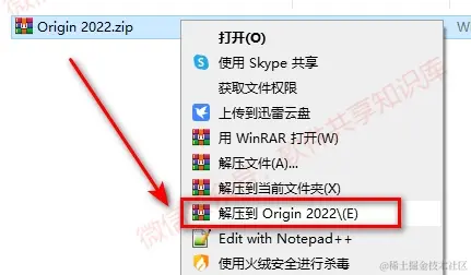1.通过文章末尾处下载软件后,选中下载的【Origin 2022】压缩包,右击选择解压到【Origin 2022】。