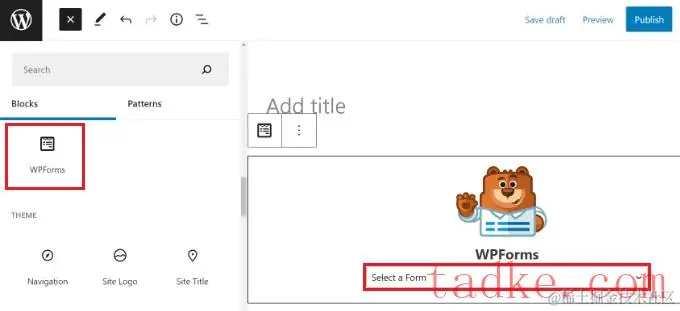 将表单添加到任何页面或帖子的另一种方法是使用WPForms块。只需将区块添加到您的内容中,然后从下拉菜单中选择您的表单。