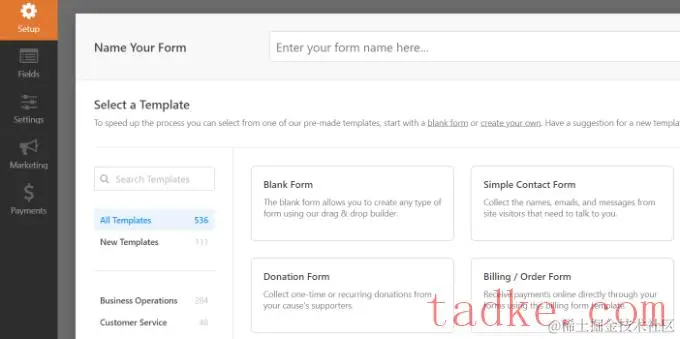 您将在右栏中看到表单预览,在左侧,您将看到可以添加到表单中的所有域。