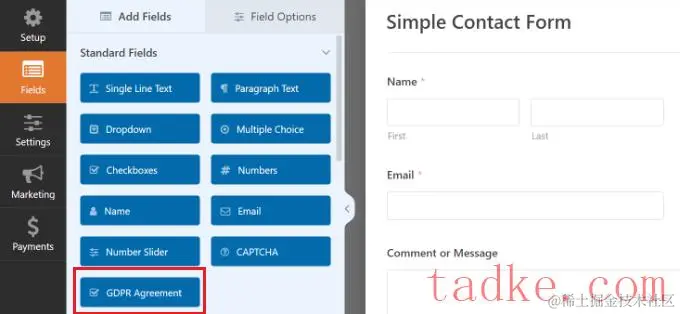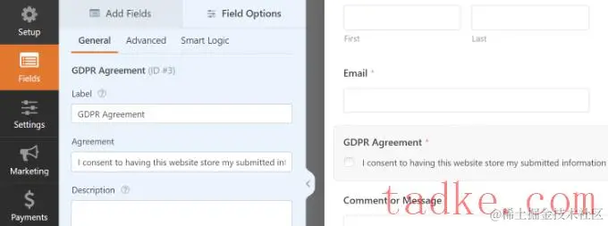 只需拖动“GDPR协议”字段并将其添加到您的表单中。